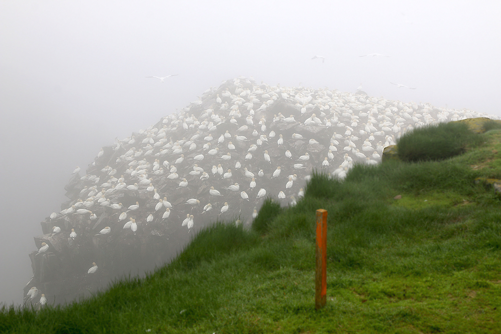 While ee were blessed with great weather throughout the tour, we did encounter a little fog at Cape St. Mary’s. Fog is a regular part of the climate in Newfoundland, especially here. But that didn’t stop us from enjoying the thousands of Northern Gannets that call this sea stack and surrounding cliffs home during the summer, nor the incredible atmosphere of this very special place.