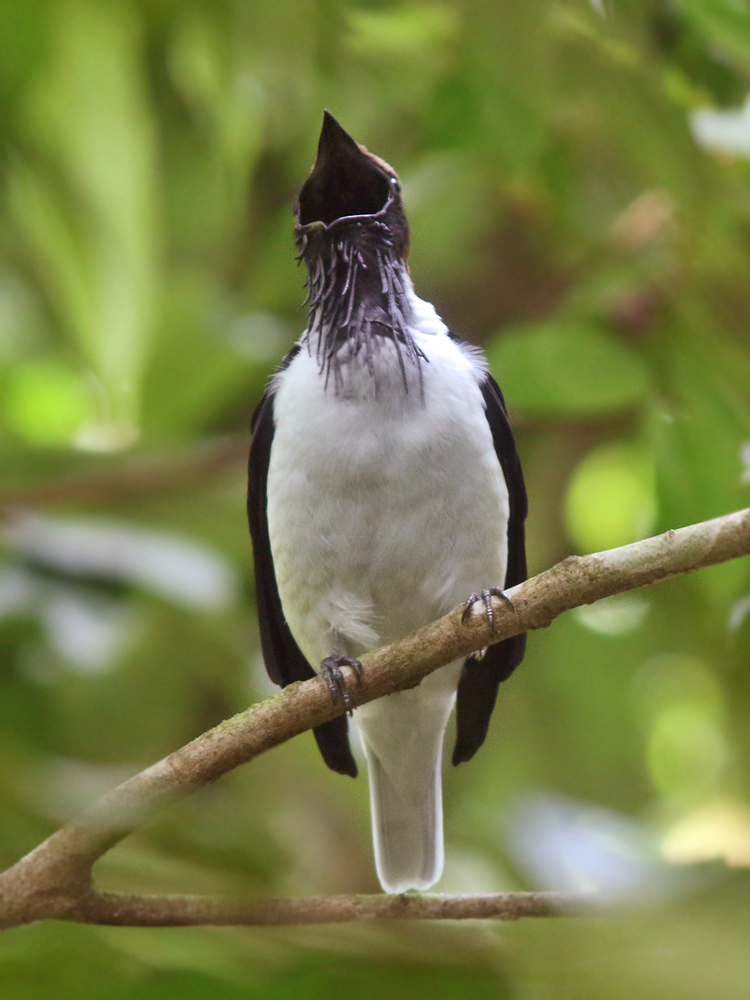 Bearded Bellbird is one of the most exciting birds that can be found on the AWNC trails. Considered the loudest bird in the world, their deafening “gong” calls travelfor miles and can often be heard echoing up the valley. We had the great fortune of finding this one on a relatively low perch, where we learned just how loud its voice could be!